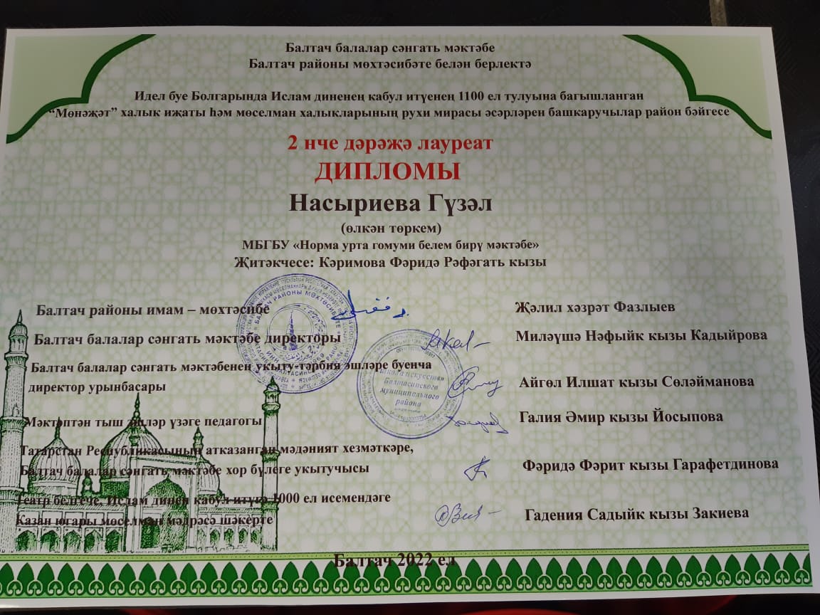 Насриева Гузэл II дәрәҗә дипломга лаек булды.
