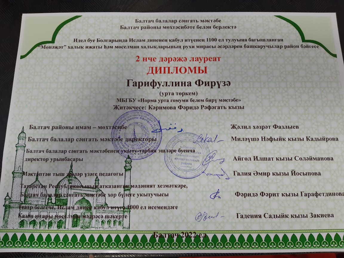 Гарифуллина Фирүзә II дәрәҗә дипломга лаек булды.