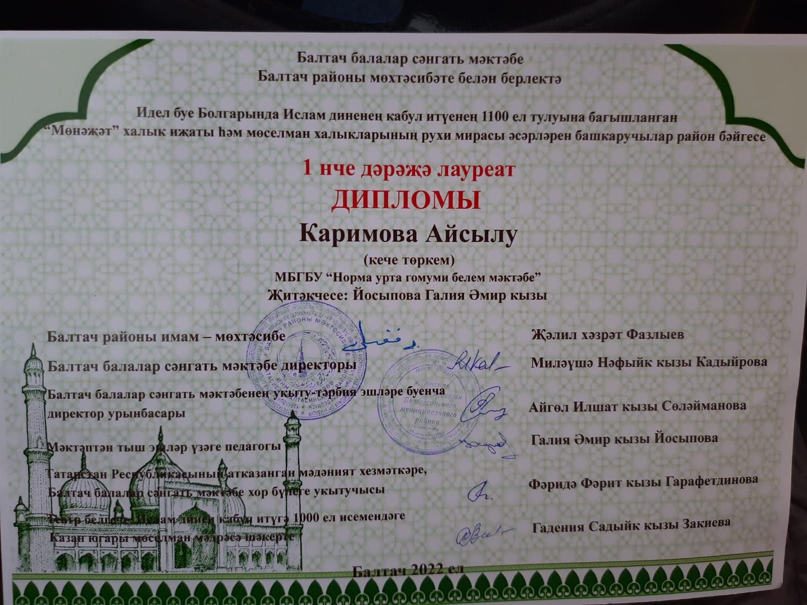 Каримова Айсылу I дәрәҗә дипломга лаек булды.