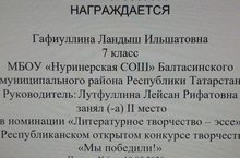 В рамках недели русского языка и литературы ученики участвовали в Республиканском открытом конкурсе творчества "Мы победили!" Гарифуллина Айгуль и Гафиуллина Ландыш заняти 2 место в номинации "Литературное творчество - эссе"