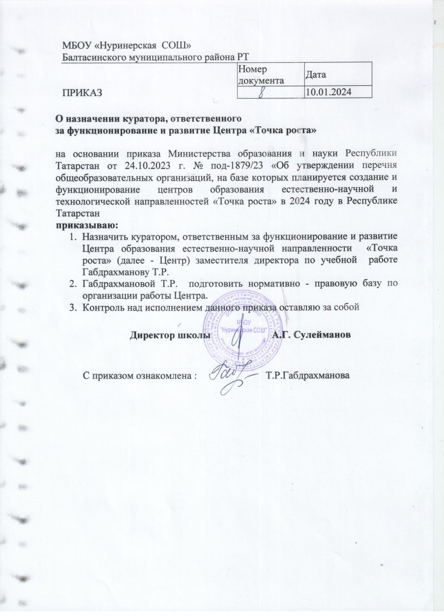 О назначении куратора, ответсвенного за функционирование и развитие центра "Точка роста"