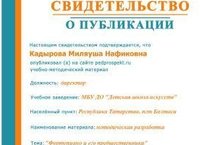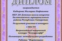 Директор ДШИ, преподаватель фортепианного отделения М.Н.Кадырова получила 1 место в номинации "Методическая разработка" во Всероссийском конкурсе "Конкурсофф"