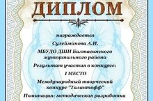 Заместитель директора по УВР, преподаватель фортепианного отделения А.И.Сулейманова получила 1 место в номинации "Методическая разработка" на Международном творческом конкурсе "Талантофф".