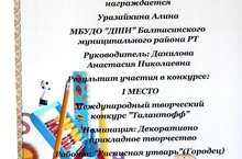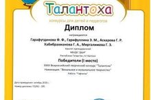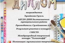 Хусайнова Г. (преподаватель Сулейманова А.И.) получила 1 место на Международном творческом конкурсе "Талантофф" в номинации "Музыкальное творчество" (фортепиано).