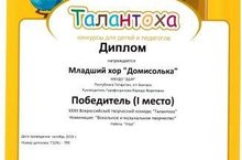 Младший хор "Домисолька" (руководитель Гарафутдинова Ф.Ф.) стал победителем 1 степени Всероссийского творческого конкурса "Талантоха"