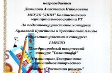 Преподавательхудожественного отделения А.Н.Данилова приняла участие в Международном творческом конкурсе "Талантофф" и получила 1 место в номинации "Декоративно-прикладное искусство" (работа "Расписная утварь")