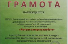 "Лучшая актерская работа" в республиканском экологическом конкурсе сценического творчества среди детей дошкольных образовательных организаций.