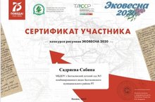 Воспитанник младшей группы Садриева Сабина за участие в конкурсе "Эковесна 2020" была награждена сертификатом