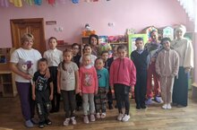 Мәктәп балалары бакчага кереп тәрбиячеләрне котлап чыктылар.