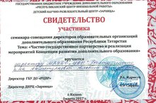 1 марта директор Центра внешкольной работы Ахметзянова Альбина Валерьевна приняла участие в семинаре – совещании директоров образовательных организаций дополнительного образования Республики Татарстан. Темой являлось: «Частично- государственное партнерство и реализация мероприятий Концепции развития дополнительного образования». Альбине Валерьевне вручено свидетельство участника. 01.03.2017