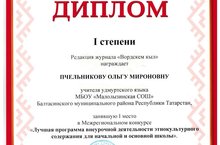 В рамках реализации Стратегии государственной национальной политики Российской Федерации на период до 2025 года, Закона Российской Федерации «О языках народов Российской Федерации, 03 ноября 2015 года в г. Ижевске проведен Межрегиональный форум «Региональная этножурналистика в области образования: современное состояние и перспективы развития», посвящённый 25-летию научно-методического журнала «Вордскем кыл». В мероприятии из нашего района участвовали учителя удмуртского языка и литературы МБОУ «Мало-Лызинская СОШ» Пчельникова Ольга Мироновна, Антонова Наталья Львовна. Работа Пчельниковой Ольги Мироновны заняла I место в Межрегиональном конкурсе «Лучшая программа внеурочной деятельности этнокультурного содержания для начальной и основной школы».