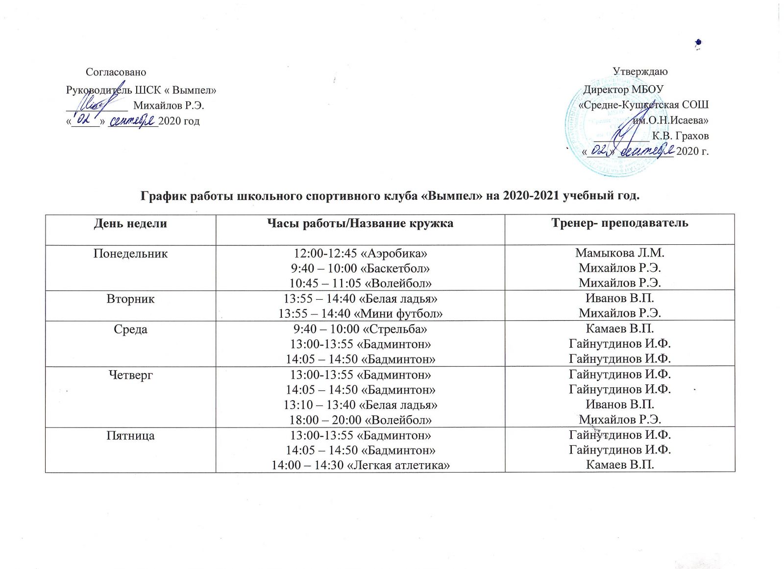 График работы ШСК "Вымпел" на 2020-2021 учебный год