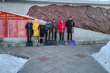 Члены тимуровского отряда очистили от снега территорию памятника односельчанам, погибшим в Великой Отечественной войне.