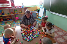 Апа төрле корылмалар ясарга өйрәтә. Бүген өй төзедек./Наша воспитательница учить нас строить домик.