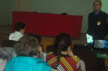 Әти-әниләр җыелышында кунакта балигъ булмаган балалар белән эшләүче өлкән инспектор полиция майоры Файзрахманов Наил Нурислам улы һәм участок инспекторы Хаҗиев Рамил Равил улы. 18.11.2014