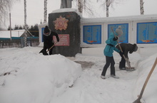 8 сыйнйф укучылары Бөек Ватан сугышында һәлак булганнар истәлегенә салынган һәйкәлне чистартып, тәртипләп торалар.