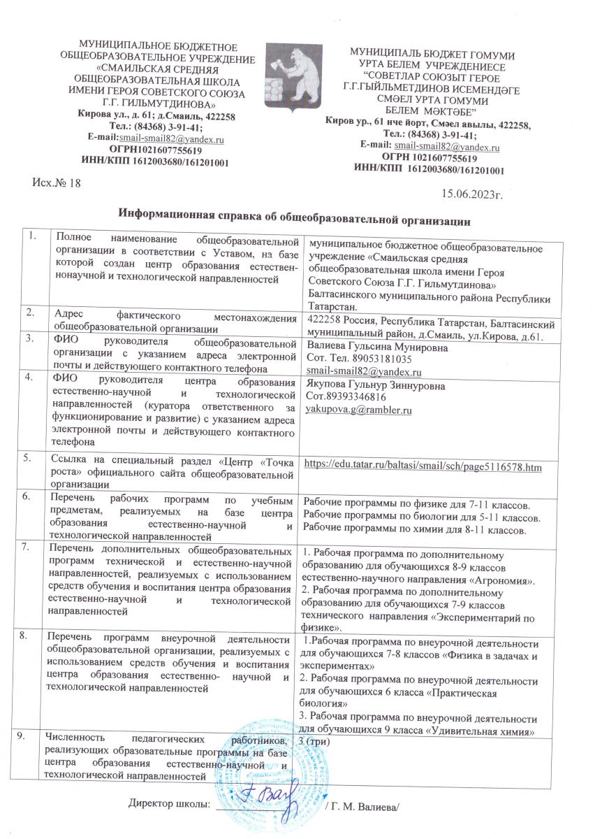 муниципальное бюджетное общеобразовательное учреждение «Смаильская средняя общеобразовательная школа имени Героя Советского Союза Г.Г. Гильмутдинова» Балтасинского муниципального района Республики Татарстан/Татарстан Республикасы Балтач муниципаль районы муниципаль бюджет гомуми белем учреждениесе «Советлар Союзы Герое Г.Г. Гыйльметдинов исемендәге Смәел урта гомуми белем мәктәбе»