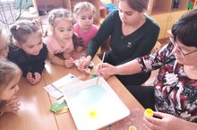 Суда рәсем ясау техникасы - Эбру техникасы, кәгазьгә ясауга караганда катлаулырак. Бу ысул белән эшләү саклык, пөхтәлек һәм сабырлык сорый. Махсус буяулар махсус инструментлар белән ясала. Инструментлары – махсус розовый агачтан һәм ат чәченнән ясалган. Тәрбияче апалар балаларга бу технология белән эшләү серләрен аңлаттылар, соңыннан балалар үзләре дә эшләп карады.