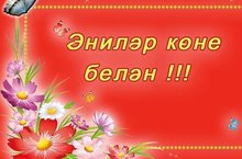 Әниләр көне белән! 26.11.2017 Әни.... Өч хәрефтән торган бу сүздә күпме наз, җылылык һәм күңел тойгысы! Әни... Һәр кеше өчен иң кадерле, иң сөйкемле зат ул! - Әни... Аның күзләре шундый ягымлы һәм мөлаем. Әйтерсең, бөтен дөньяның акылын һәм сабырлыгын җыйган диңгез! Ә әнкәйнең куллары иң-иң җылы, иң-иң кадерле куллардыр , мөгаен. Шул ягымлы куллар сиңа кагылуга, бөтен кайгыларың югала, Ә балам дип аркаңнан сыйпаса, сиңа гүя канатлар үсә. Ә сүзләре... Сүзләре шундый татлы, туң йөрәкләрне эретерлек җылы. Ә авырсаң төннәр буе яныңнан да китми инде ул! Бары әнкәйләр йөрәге генә шулкадәр түземле, шәфкатьле! Әни! Дөньяда иң кадерле, иң якын кеше ул.
