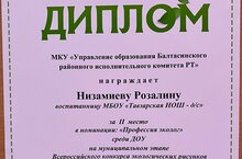 Поздравляем воспитанницу Низамиеу Розалину с дипломом за 2 место во Всероссийском экоконкурсе "Профессия эколог"/Уңышлы чыгыш ясавы белән котлыйбыз Розалинаны. Җитәкчесе Нәбиева И.Г.