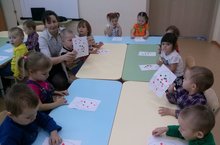 Изучение слов по теме: "Части тела" (нос, глаза, волосы, лицо и т.д.). Дети с удовольствием повторяют за Эндже Фаритовной, запоминают и показывают на себе.