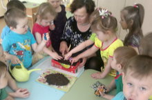 Воспитатель младшей группы Гаврилова Н.Л. с детьми сеют цветы.