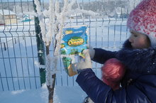 Дети подготовительной группы очищают кормушки от снега после обильного снегопада.
