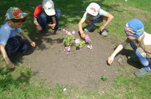 Мальчики помогают воспитателям в посеве цветов на участке ДОУ