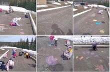 На прогулке дети подготовительной группы рисовали на асфальте мелками
