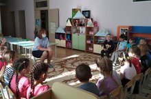 Сотрудники ОГИБДД и ГБУ "БДД" Садыков А.Р. и Хадиева Л.М. провели с детьми беседу по правилах безопасного поведения на дорогах. Дети очень активно участвовали в беседе