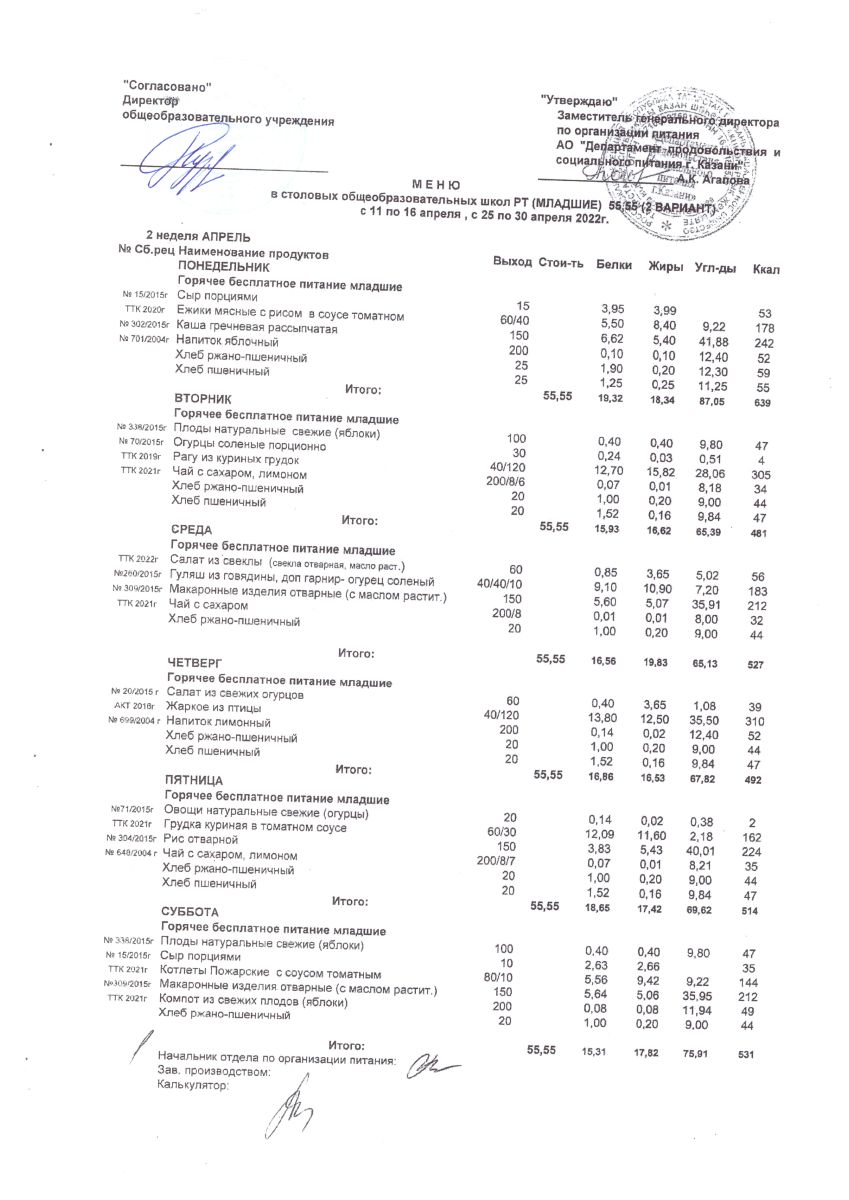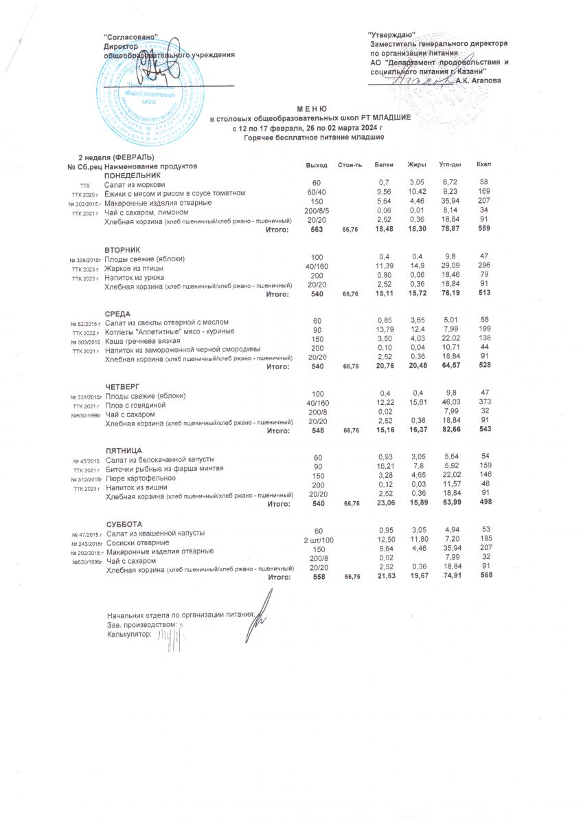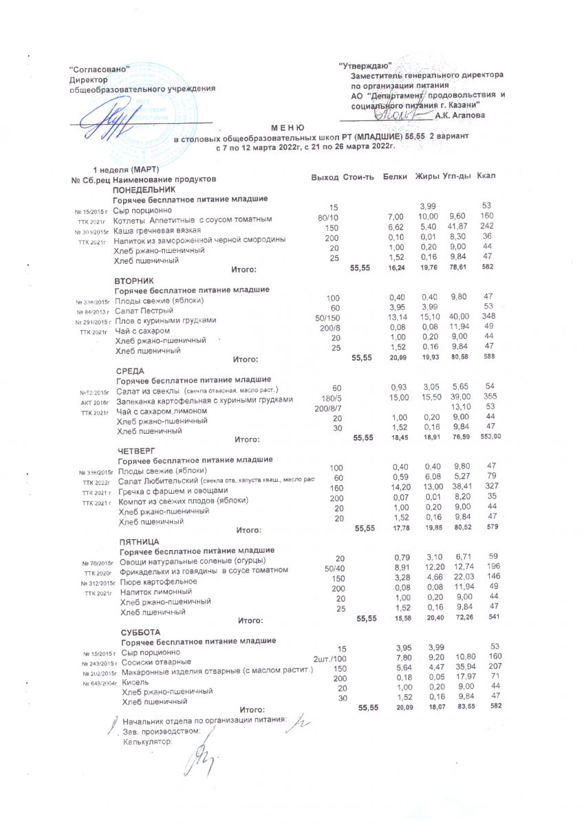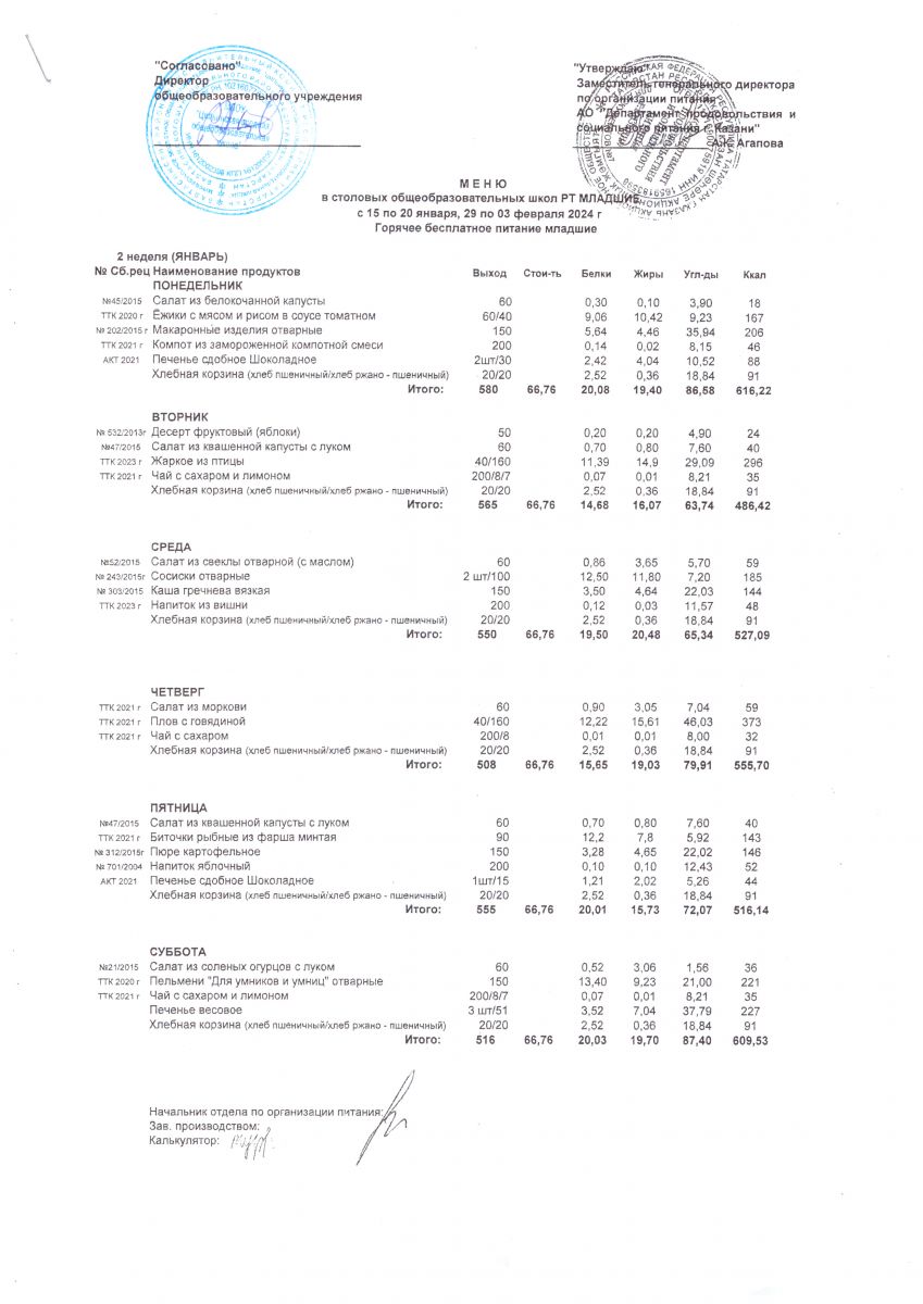 Примерное меню для организации питания для обучающихся младших классов. 2 неделя