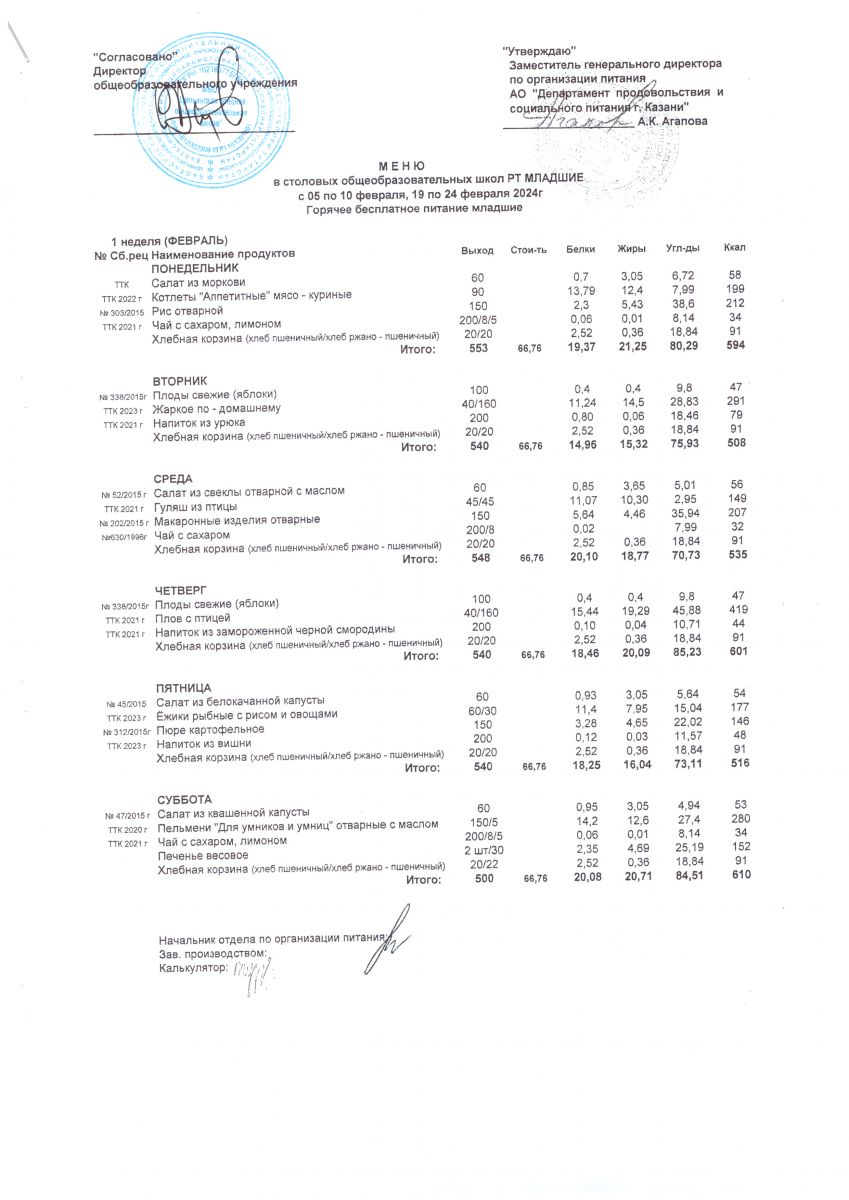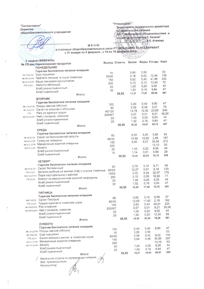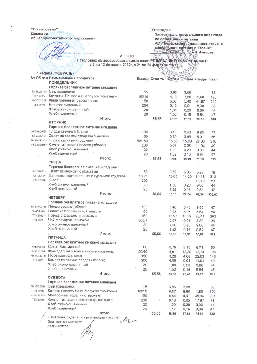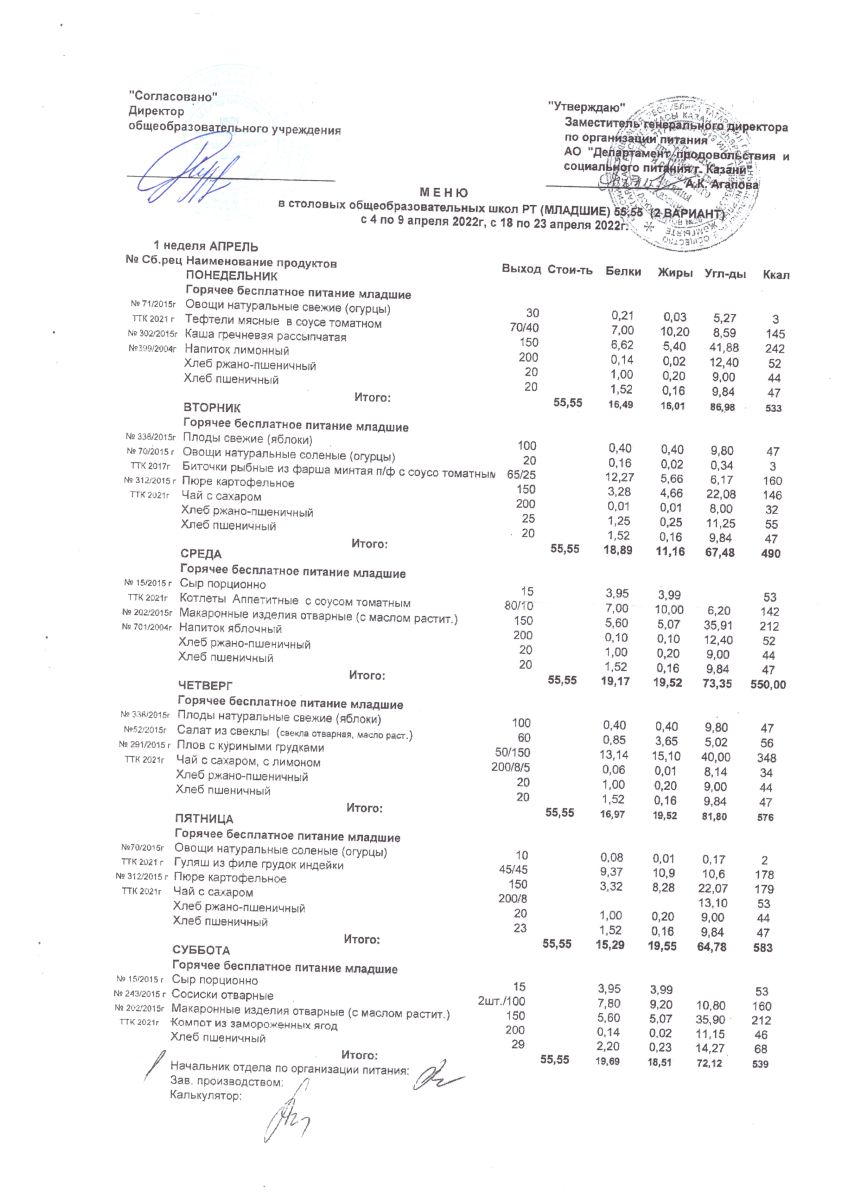 Примерное меню для организации питания для обучающихся младших классов. 2 неделя