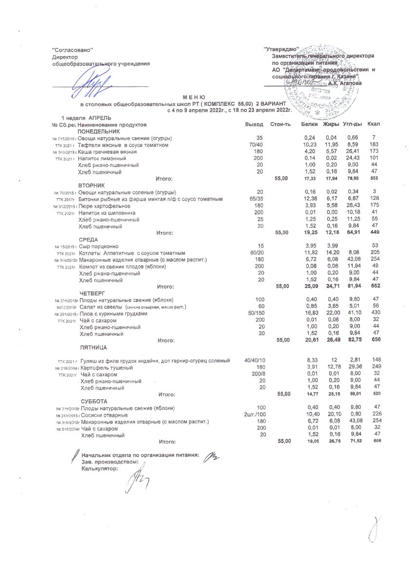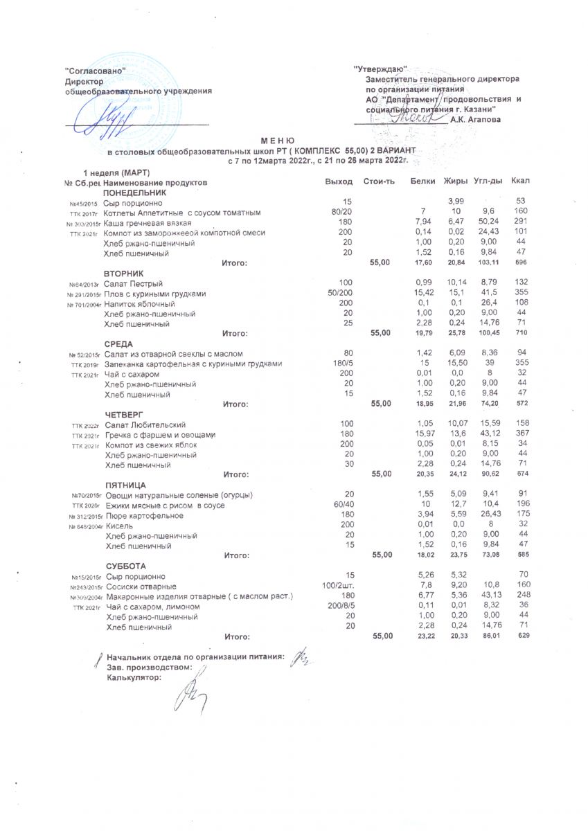 Примерное меню для организации питания для обучающихся старших классов. 1 неделя