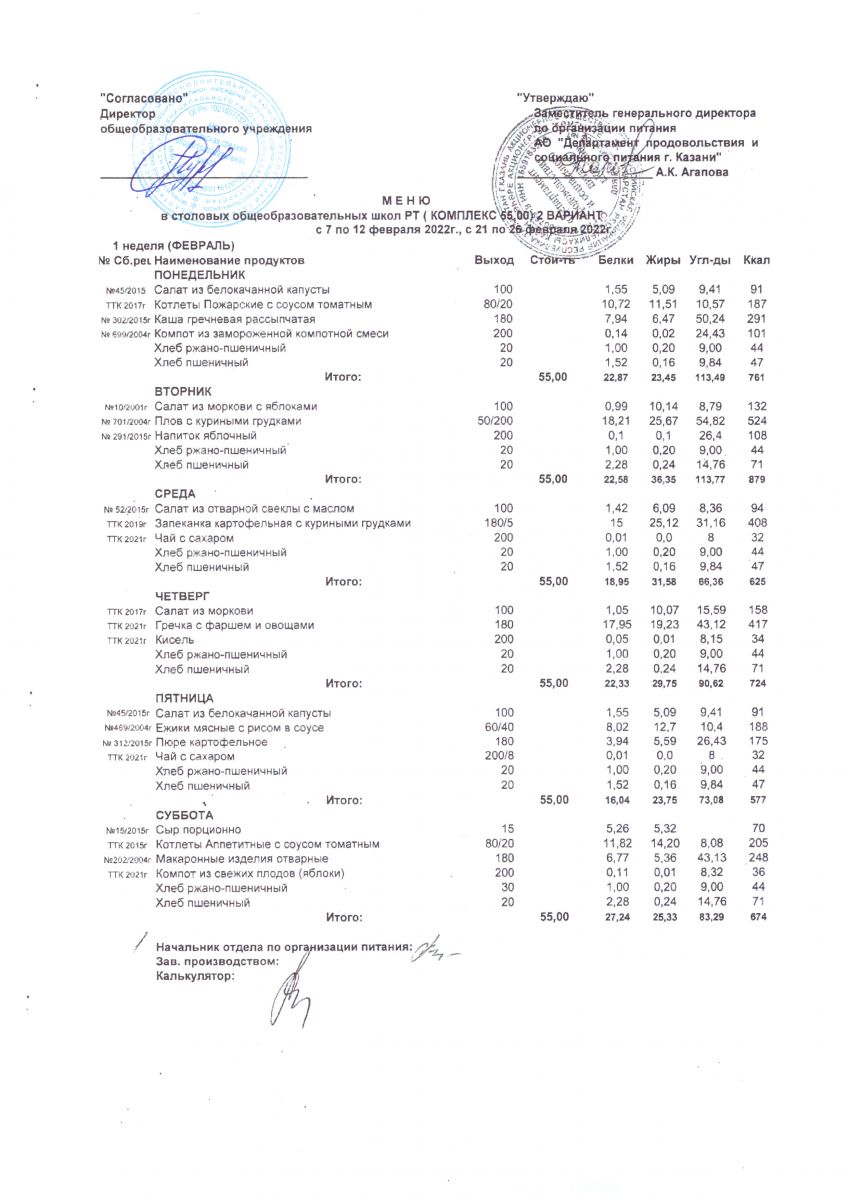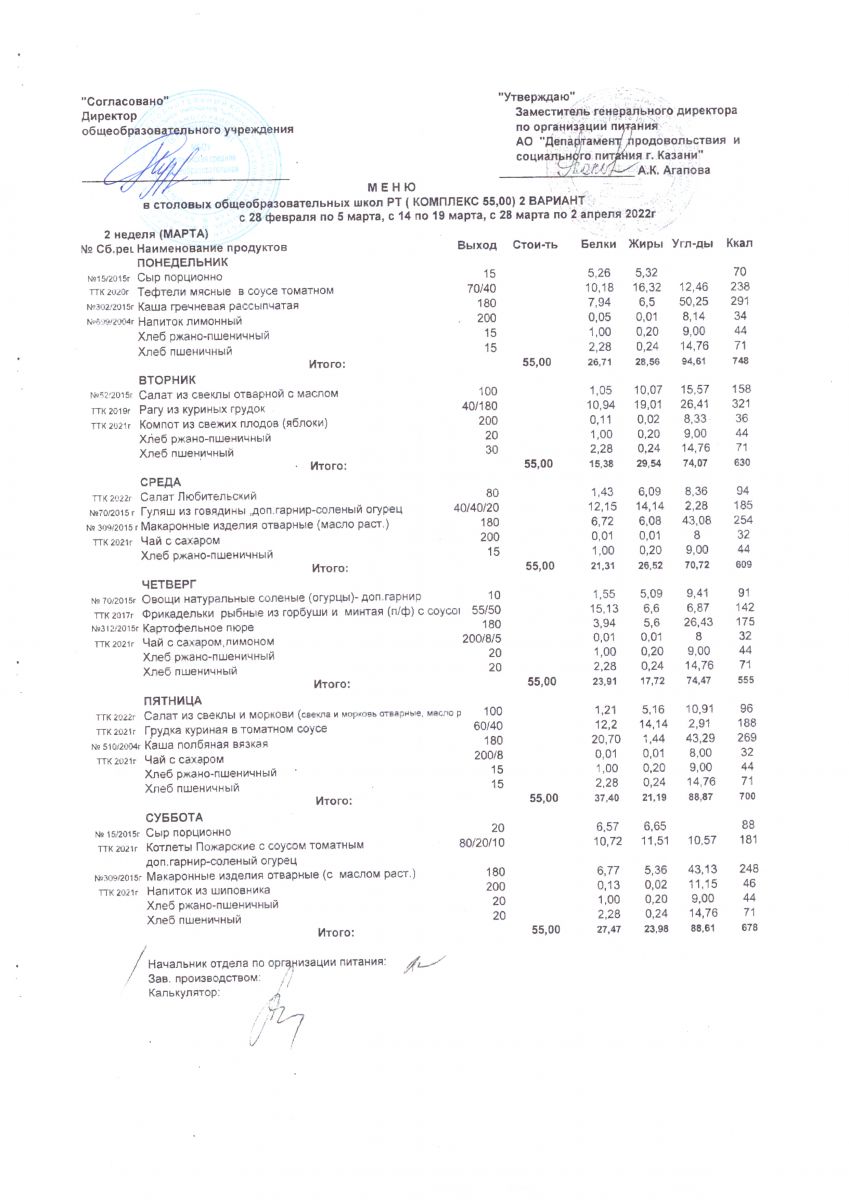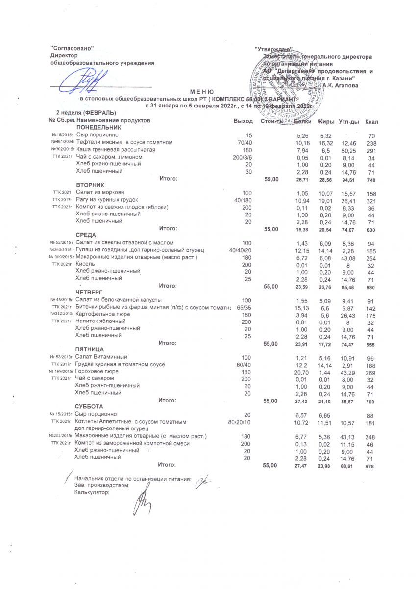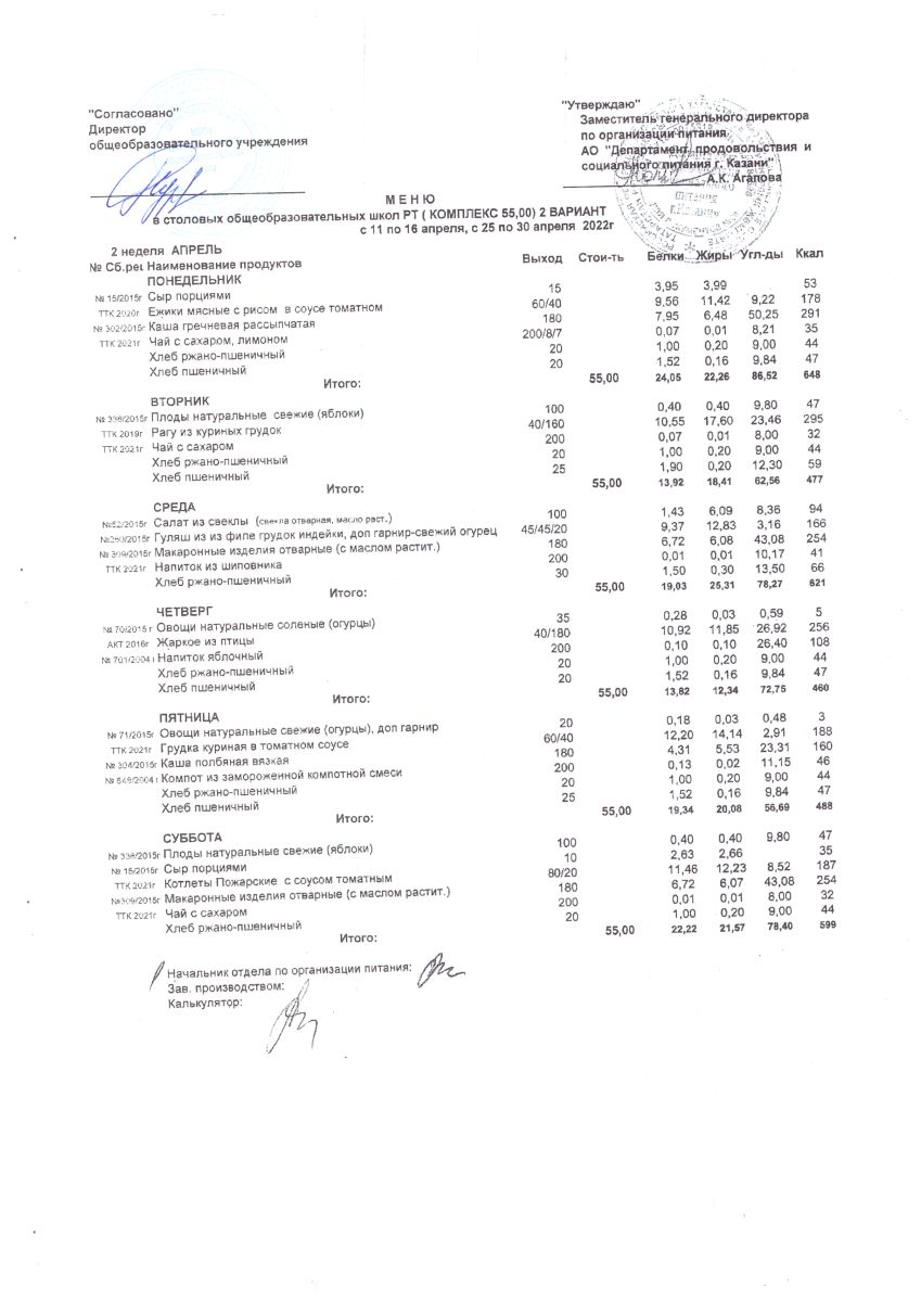 Примерное меню для организации питания для обучающихся старших классов. 2 неделя