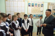 Мәктәп музеенда ветеран укытучы Зарипов Р.Ш. укучылар белән очрашты һәм авыл тарихы турында сөйләде, Бөек Ватан сугышына кагылышлы күп кенә мәгълуматлар бирде.