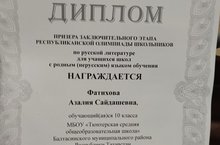 Ученица 10 класса Фатихова Азалия стала призером Республиканской олимпиады школьников по русской литературе.Руководитель Басырова Г.Т Поздравляем!!!
