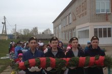 Мәктәптә Бөек Җиңүгә багышланган митингка әзерлек бара. 11 сыйныф укучылары Бөек Ватан сугышында корбан булучыларга куелган һәйкәлгә куярга гирлянда ясадылар.