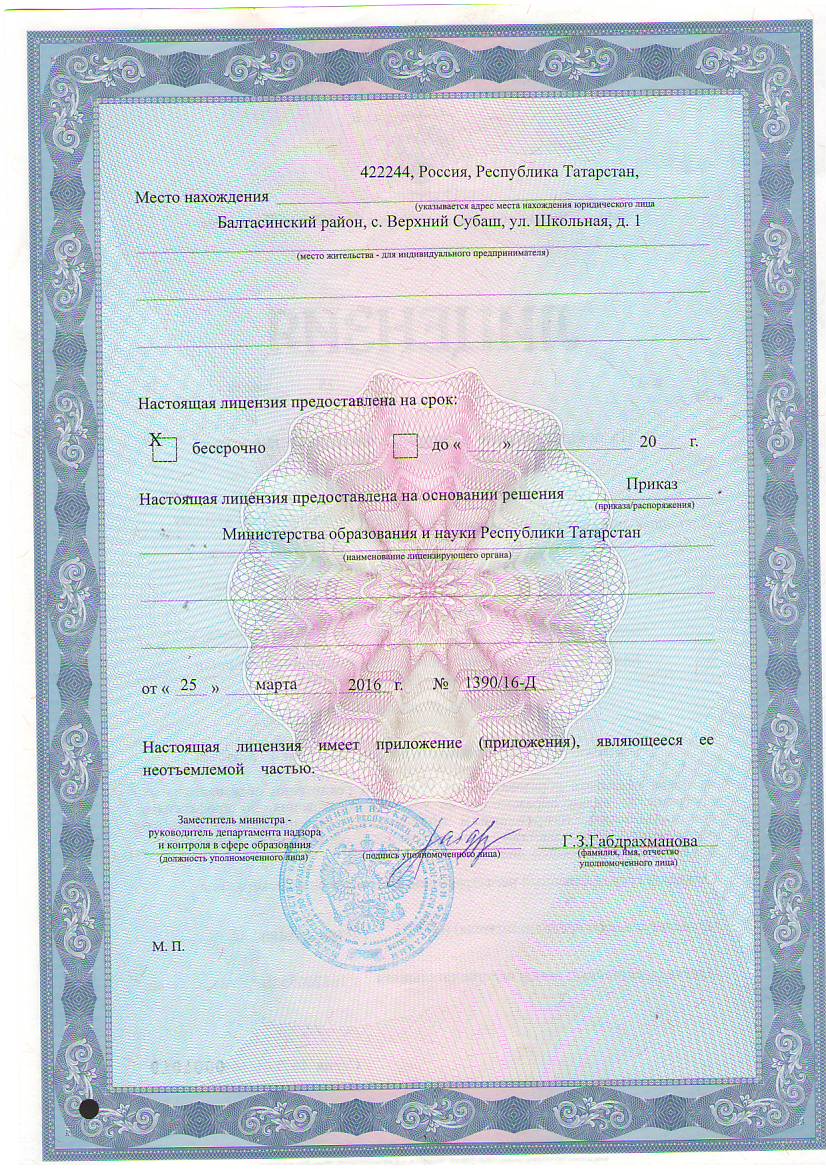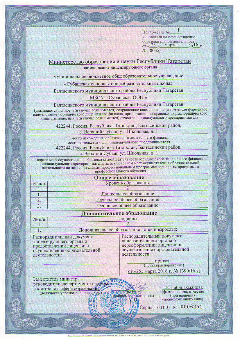 Адрес: 422244, Россия, Республика Татарстан, Балтасинский муниципальный район, c. Верхний Субаш, ул. Школьная, д. 1