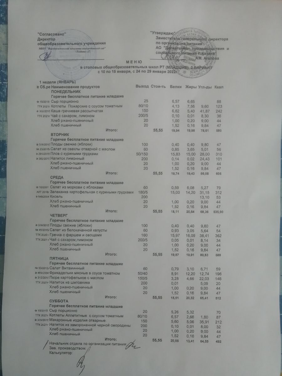 Меню бесплатное для младших школьников за январь 2022-1 неделя