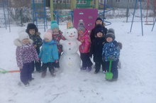 На прогулке ребята были очень рады снегу. Слепив маленький комочек, они покатили его по снегу, как тут же вырос большой ком. Вот тут и возникла идея слепить снеговика. Комочек за комочком… Вот и получился снеговик. Но тут фантазиям ребят не было предела. Они приделали ему руки, а на голову одели ведерко. Разукрасили его красками. Снеговик получился на славу!