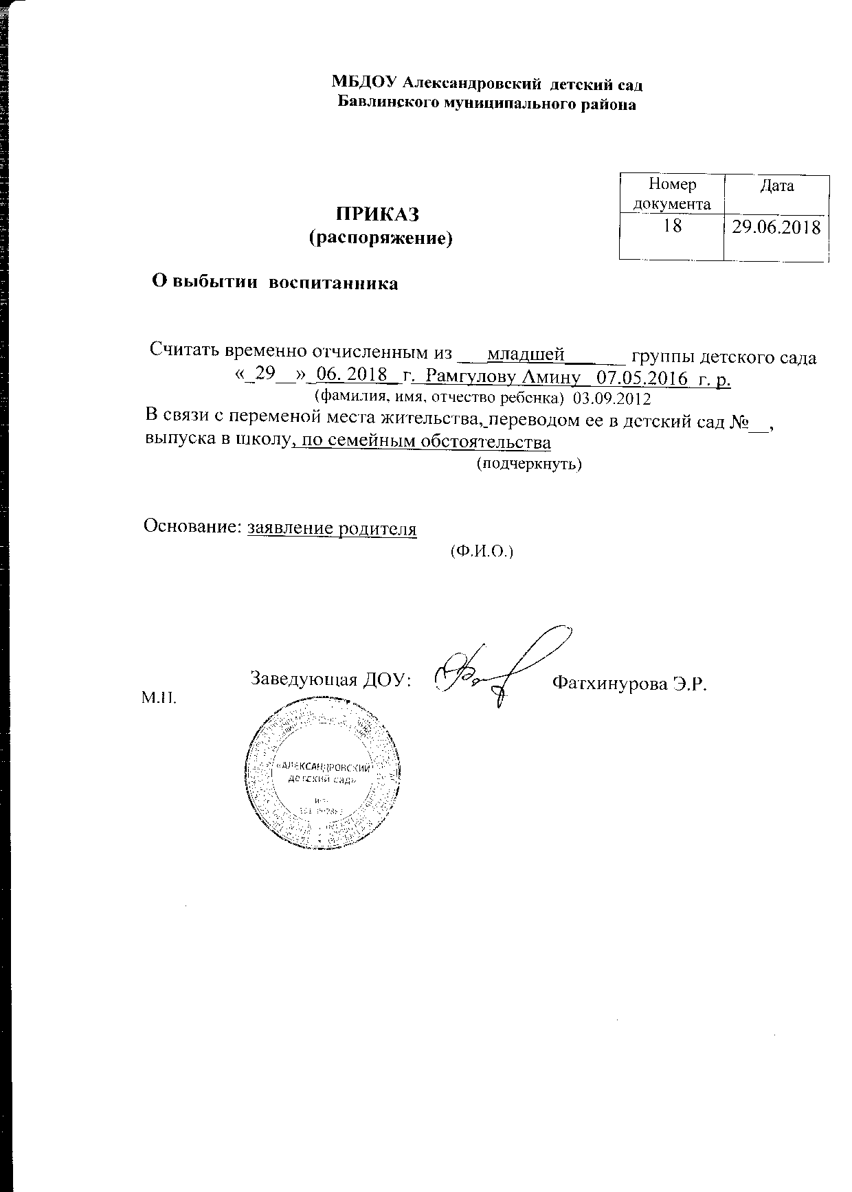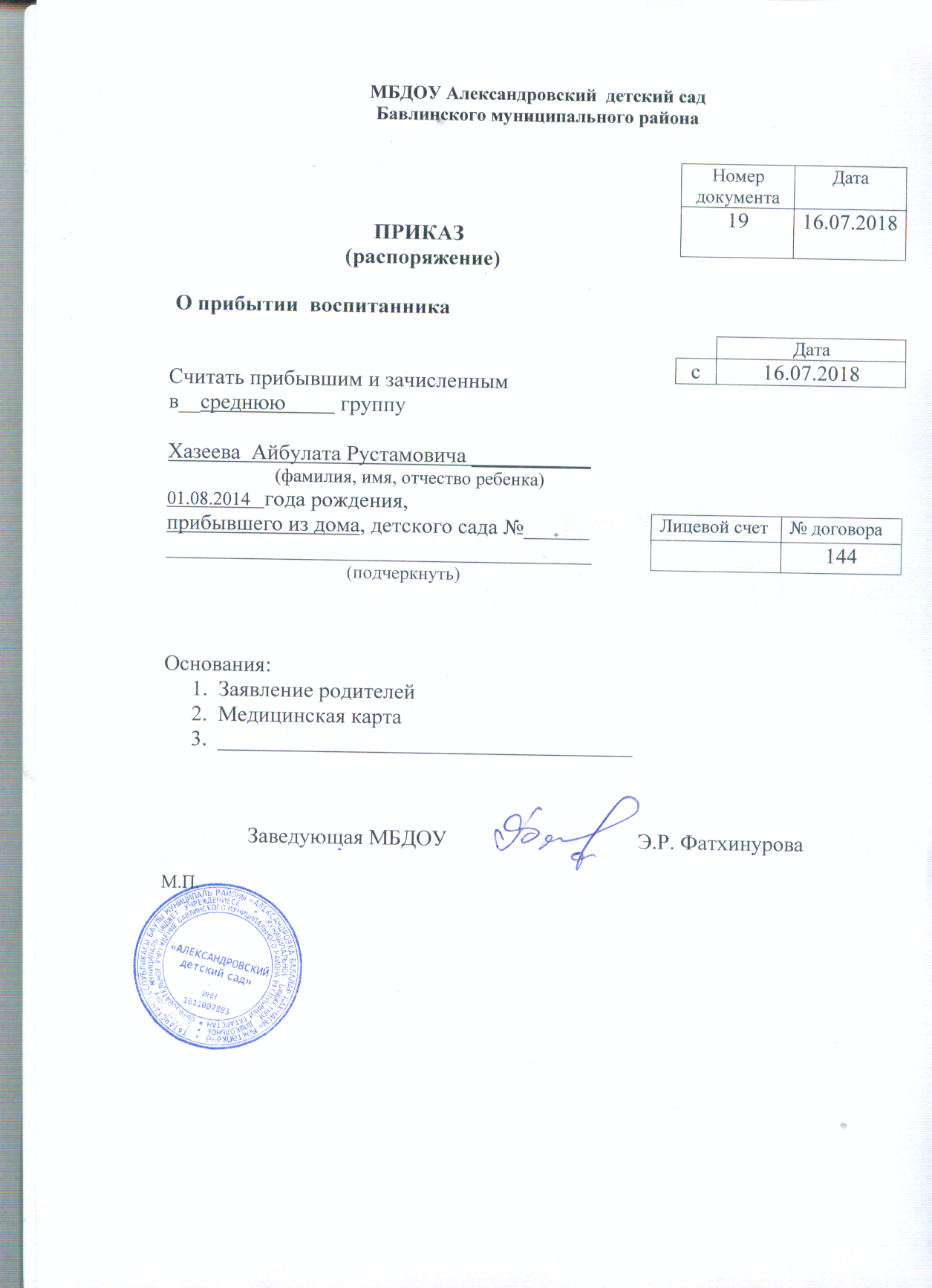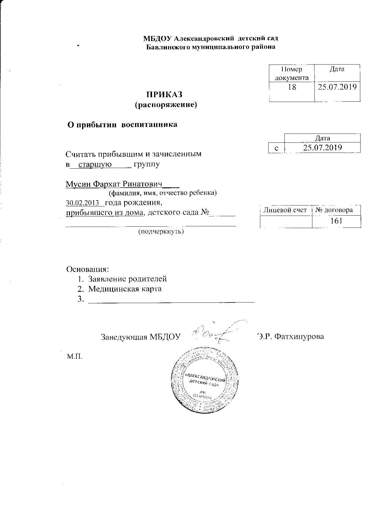 Приказ о прибытии в старшую разновозрастную группу 1воспитанника № 18 от 25.07.2019г.bmp