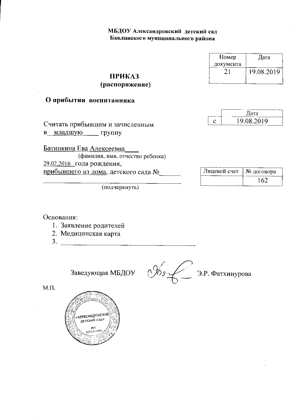 Приказ о прибытии в младшую разновозрастную группу 1 воспитанника № 21 от 19.08.2019г.bmp