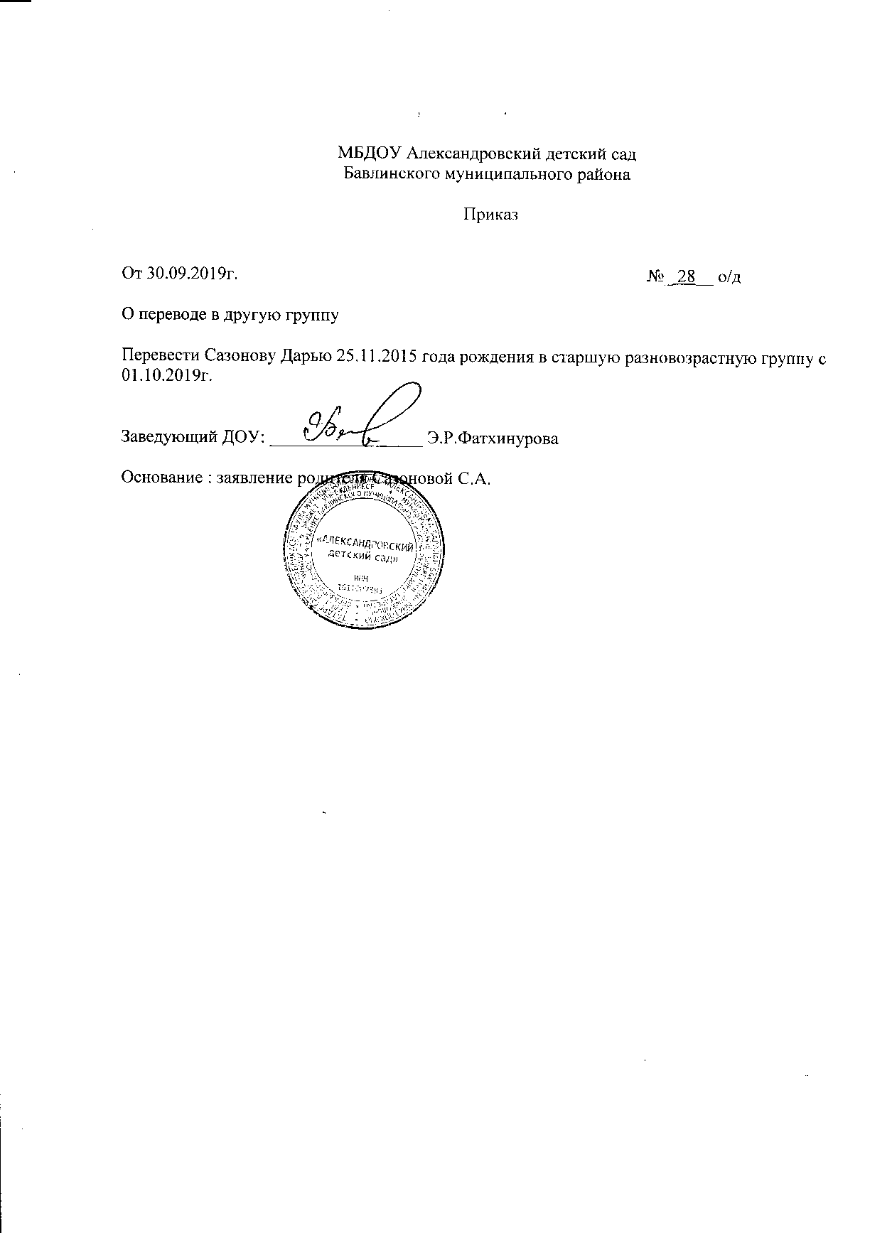 Приказ о переводе из младшей в старшую разновозрастную группу № 28 от 30.09.2019г 1 воспитанника.bmp