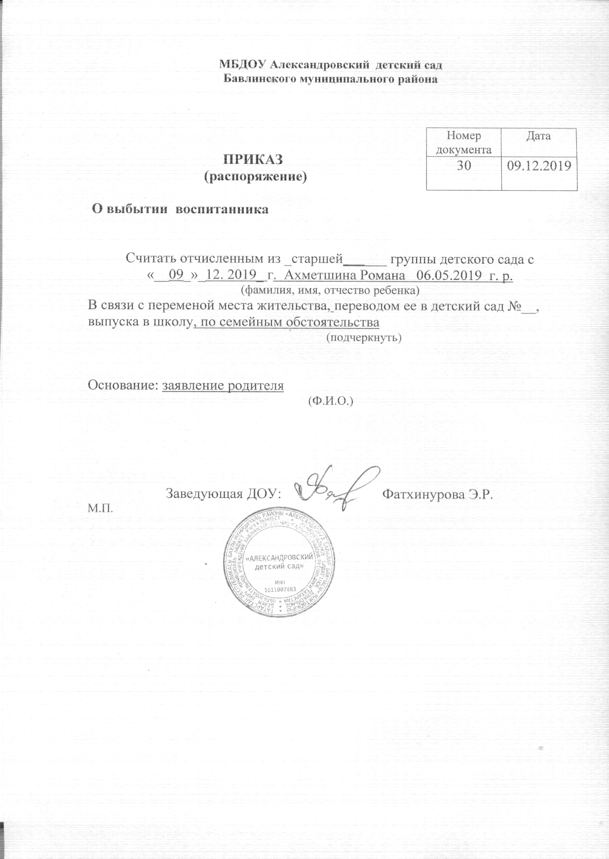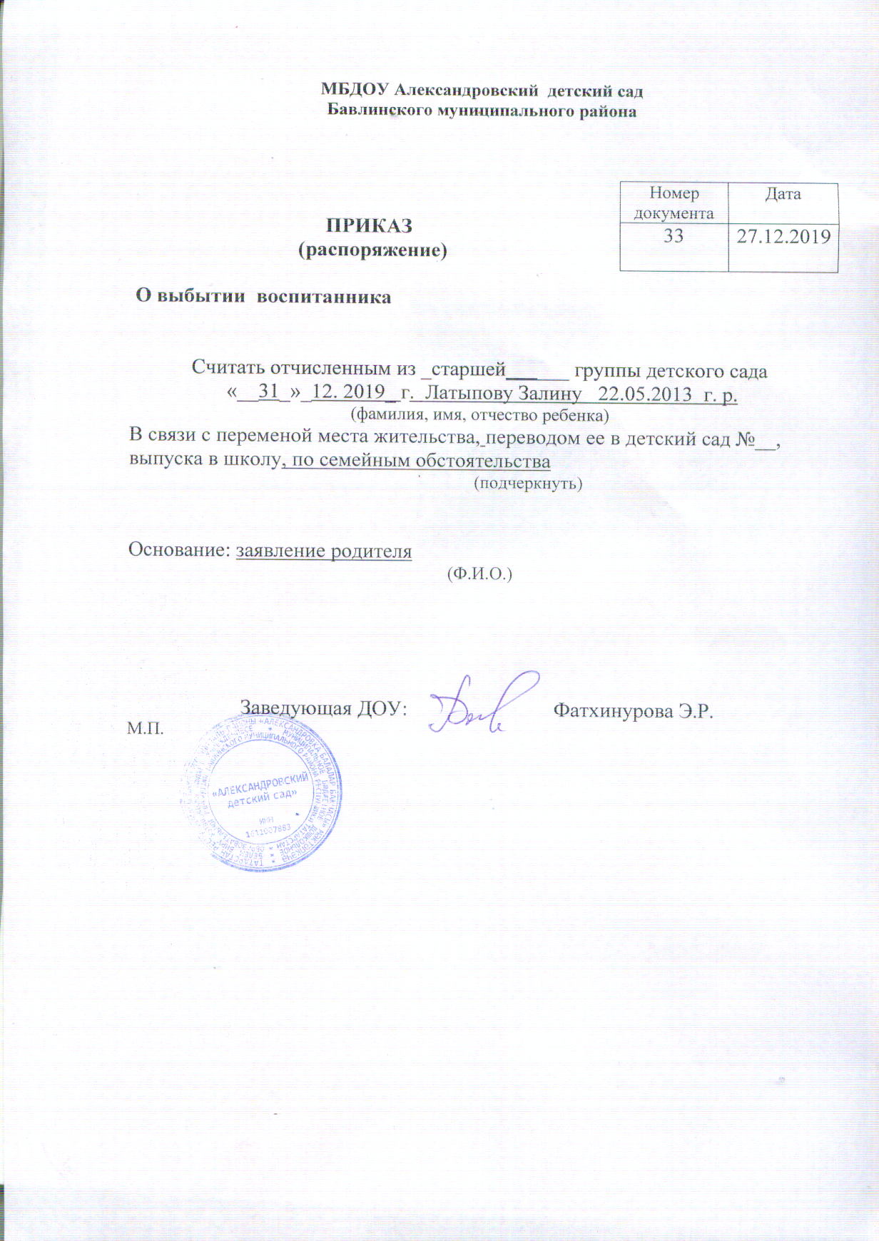 Приказ о выбытии воспитанника из старшей группы № 33 от 27.12.2019г 1 воспитанник.bmp