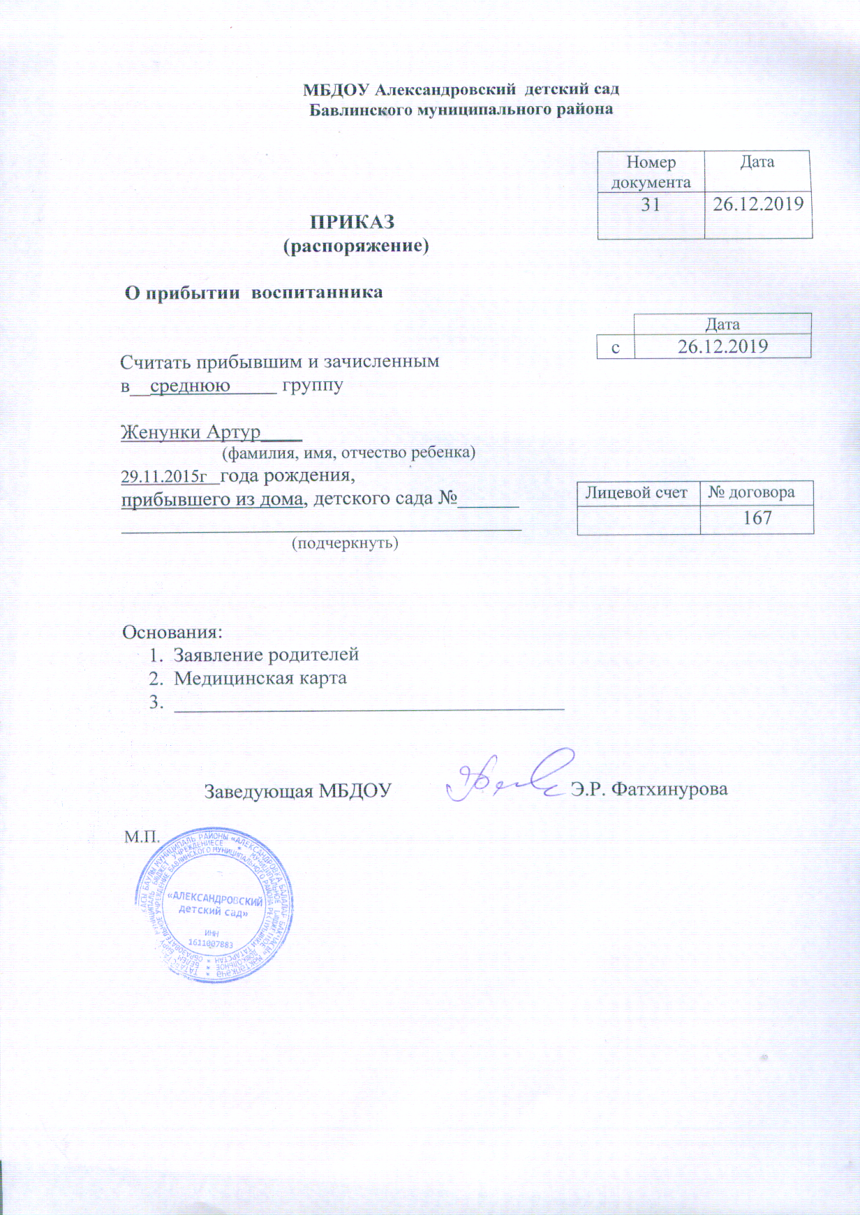 Приказ о прибытии воспитанника в среднюю группу № 31 от 26.12.2019. 1 воспитанник bmp