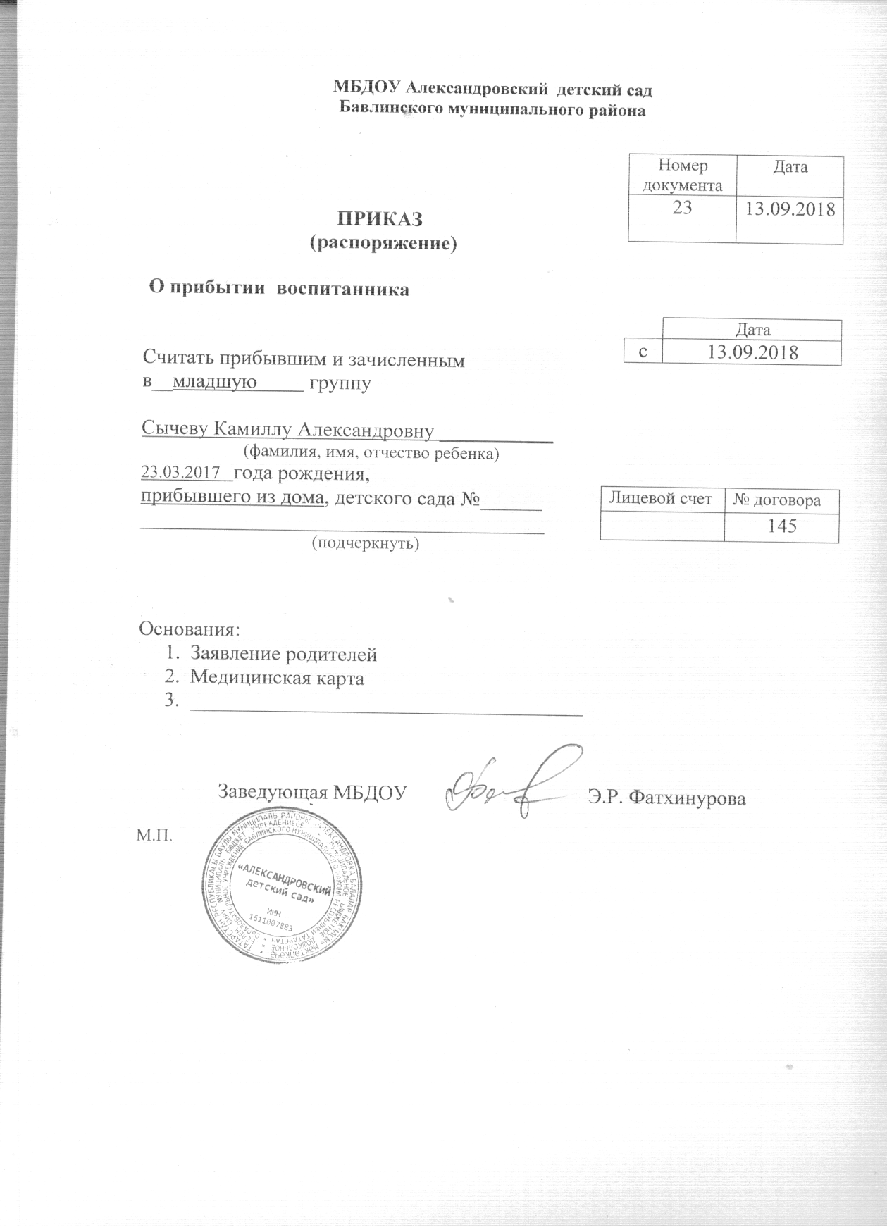 приказ о прибытии в младшую разновозрастную группу 1 воспитанника № 23 от 13.09.2018г.bmp