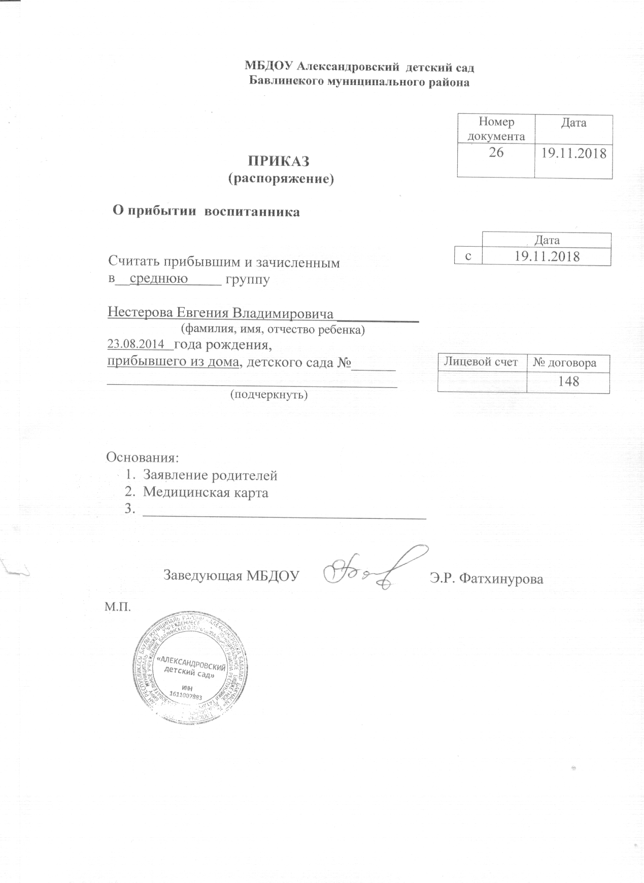 приказ о прибытии в среднюю разновозрастную группу 1 воспитанника № 26 от 19.11.2018г.bmp