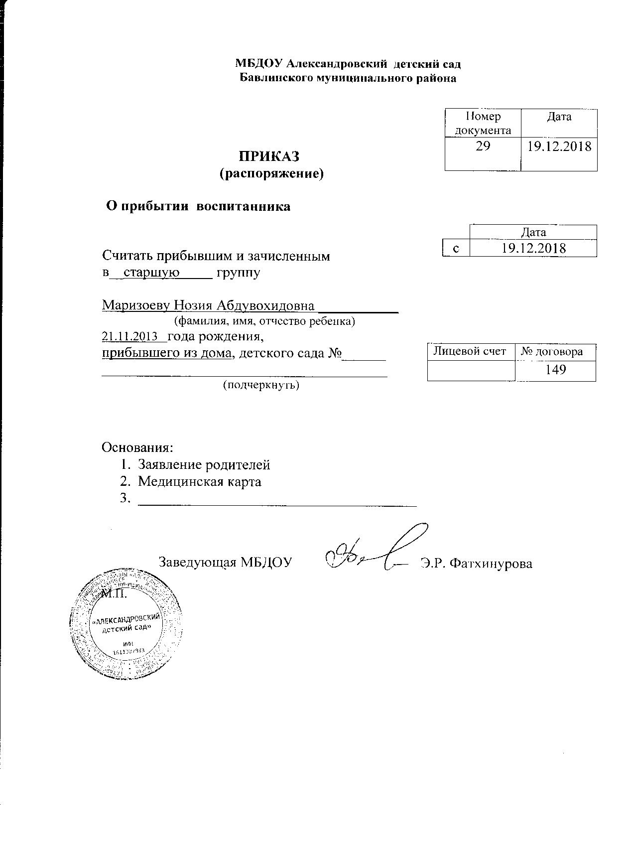 Приказ о прибытии в старшую разновозрастную группу 1 воспитанника № 29 от 19.12.2018г.bmp
