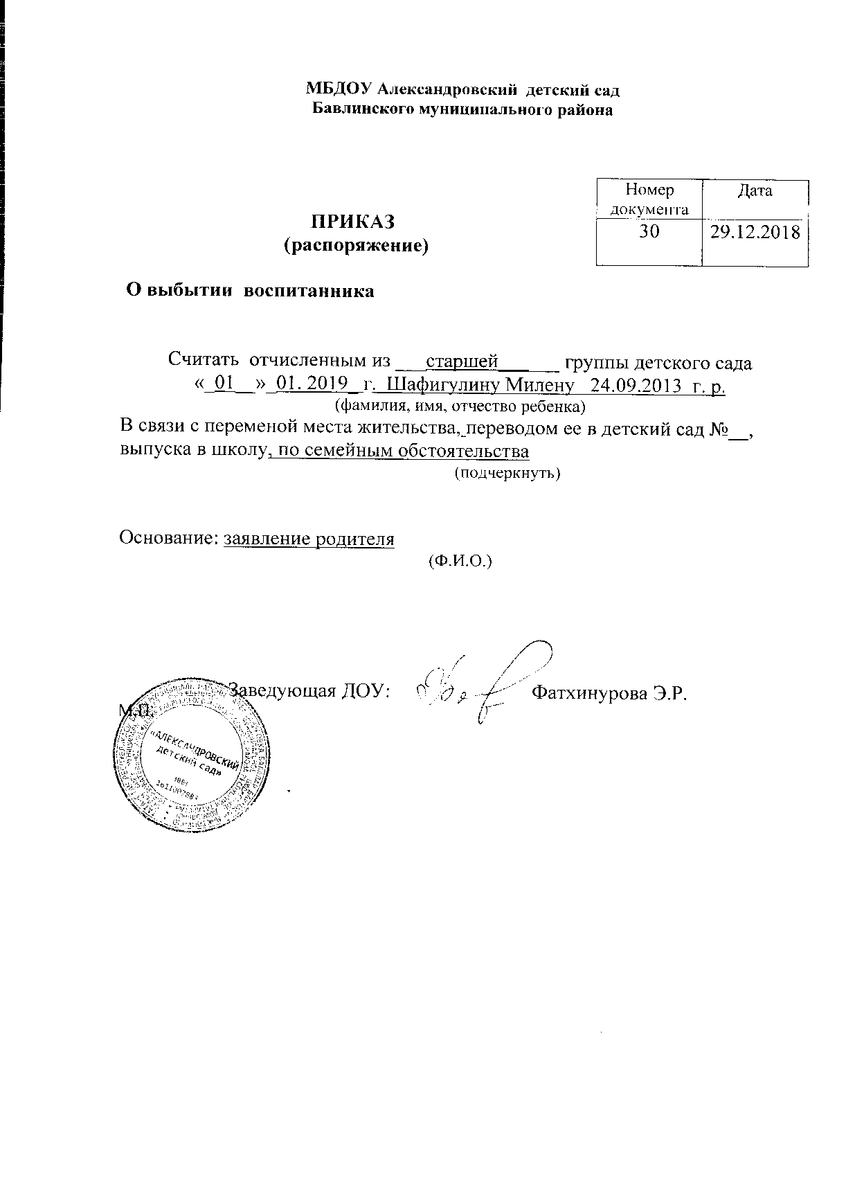 Приказ о выбытии из старшей разновозрастной группы 1 воспитанника № 30 от 29.12.2018г.bmp