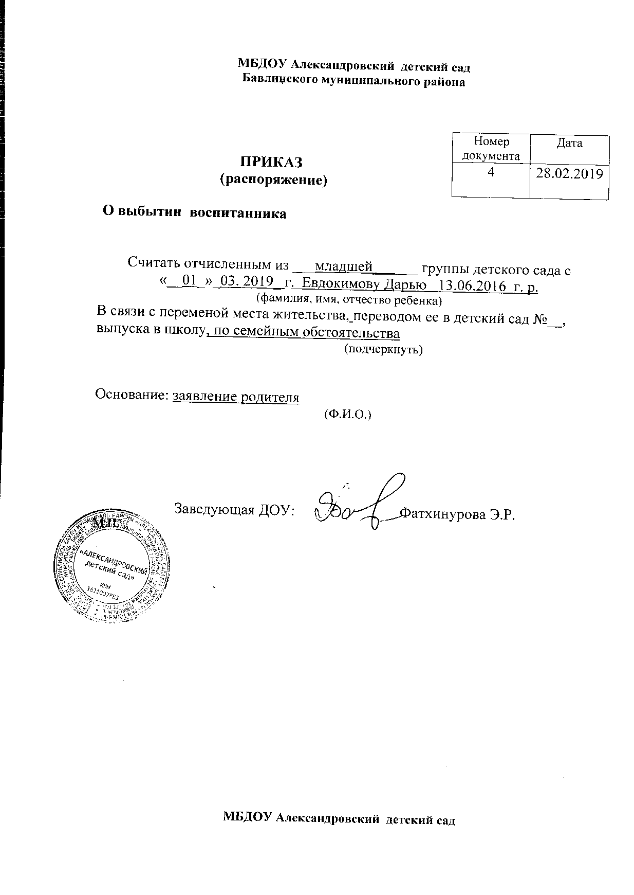 Приказ о прибытии в старшую разновозрастную группу 1 воспитанника № 4 от 01.03.2019г..bmp